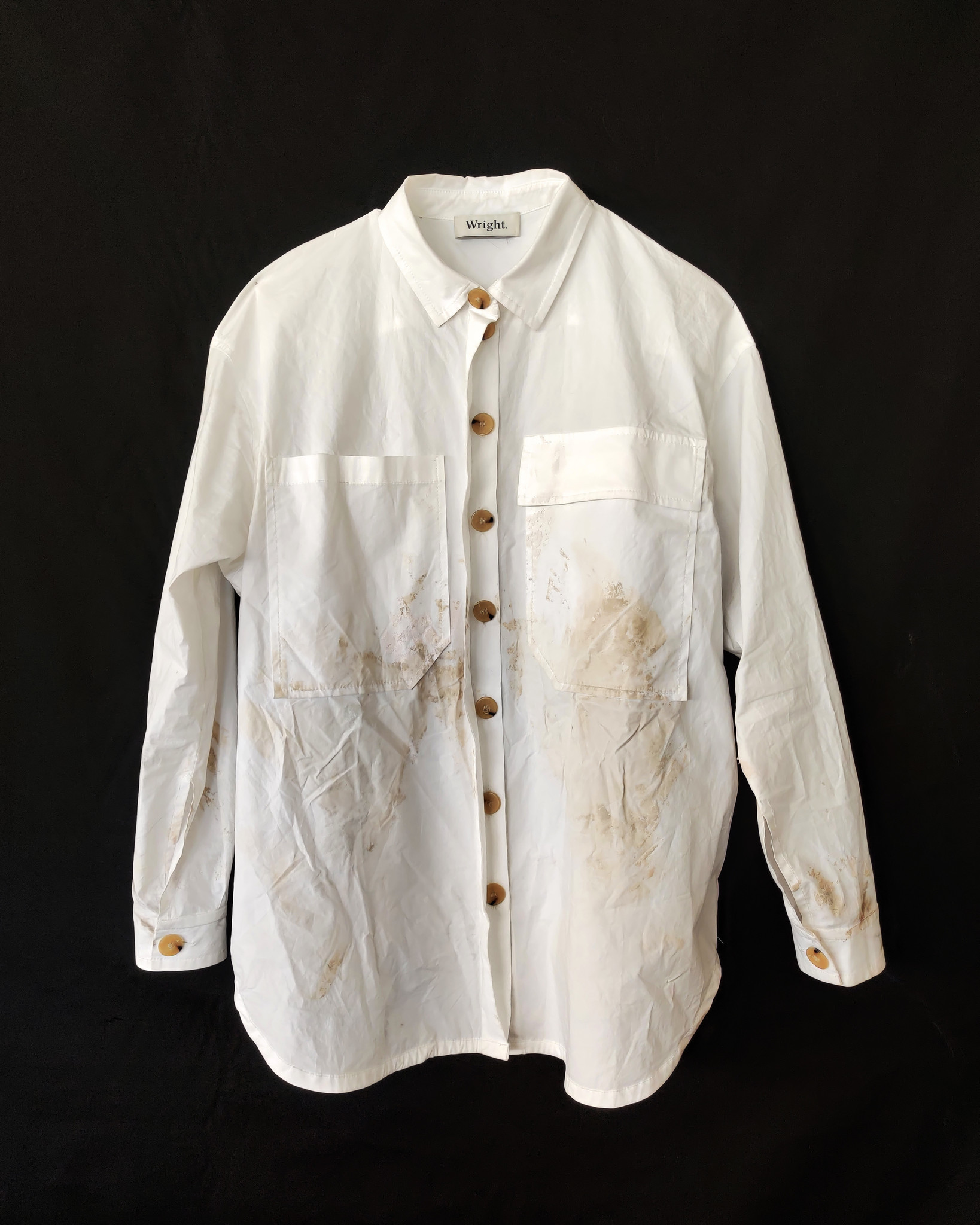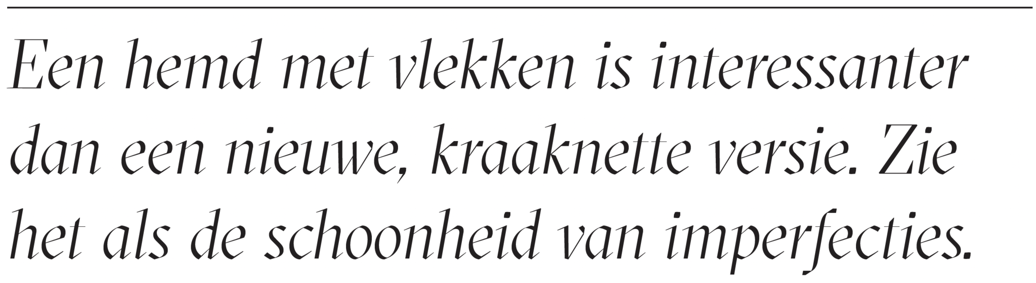 | Voor mij is het perfect, ik denk er niet aan om het te herstellen: ik draag een stuk geschiedenis. Het materiaal spreekt wanneer je naar de imperfecties kijkt.” Ze begrijpt de drang naar ongeschonden en ongedragen kledij niet. “Mensen met witte sneakers die gruwelen bij de eerste zwarte veeg die erop komt. Hoezo? Een stuk krijgt net charme als het leeft en gedragen wordt. Het is toch de bedoeling van schoenen dat je ermee buiten komt?” | Ze lacht, maar bedenkt dan: “Tot je het loslaat, dan moet je opeens moeite doen voor vlekken en krassen. Onverklaarbaar. Voor dit witte hemd heb ik echt mijn best moeten doen. Trek vervolgens een outfit aan die je absoluut niet vuil wilt maken en hij is binnen de vijf minuten verpest. Het toeval laat zich niet dwingen, zeker?” |