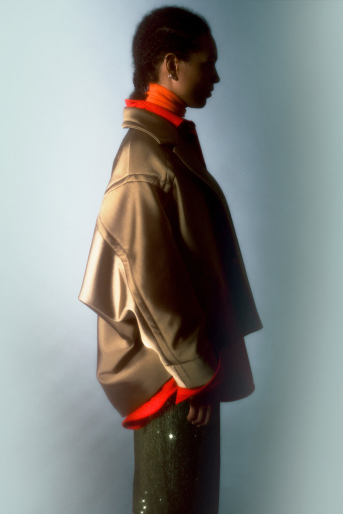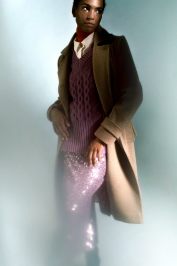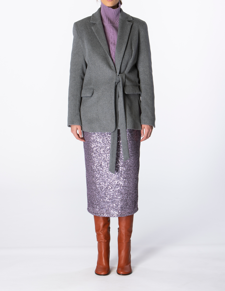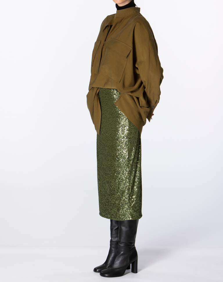 This pencil skirt with all-over sequins is the perfect styling piece. Our wintercollection is all about textures and contrasts. We love to play with different fabrics to create a grand layered look, especially on colder days. Combine it with an oversized blouse and large coat to show a subtle spark or go all-out with an extra soft cropped pullover.